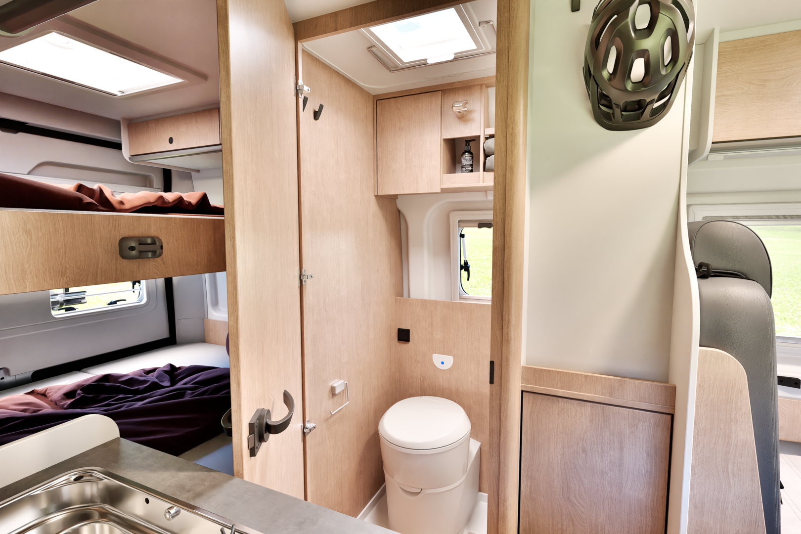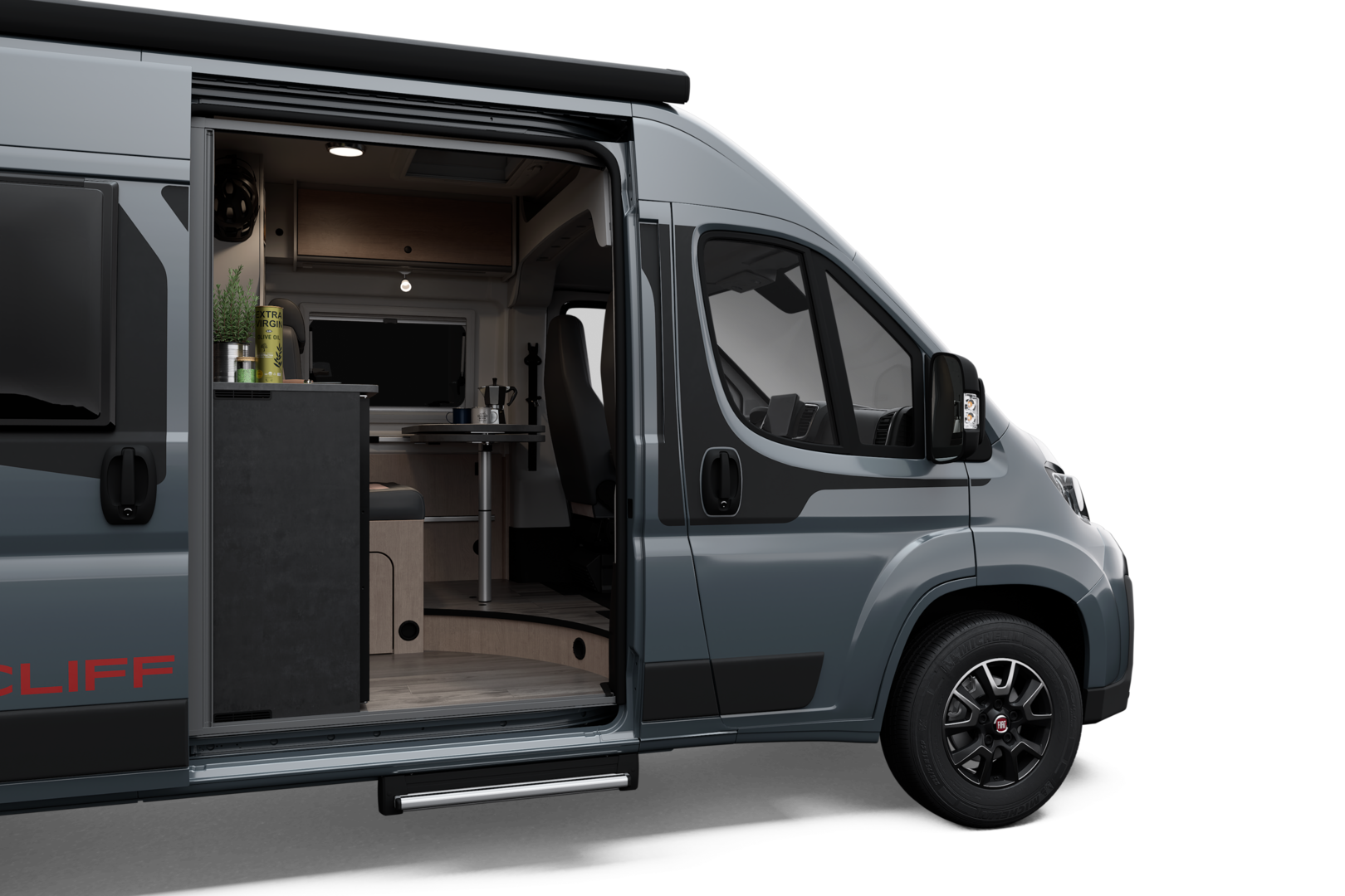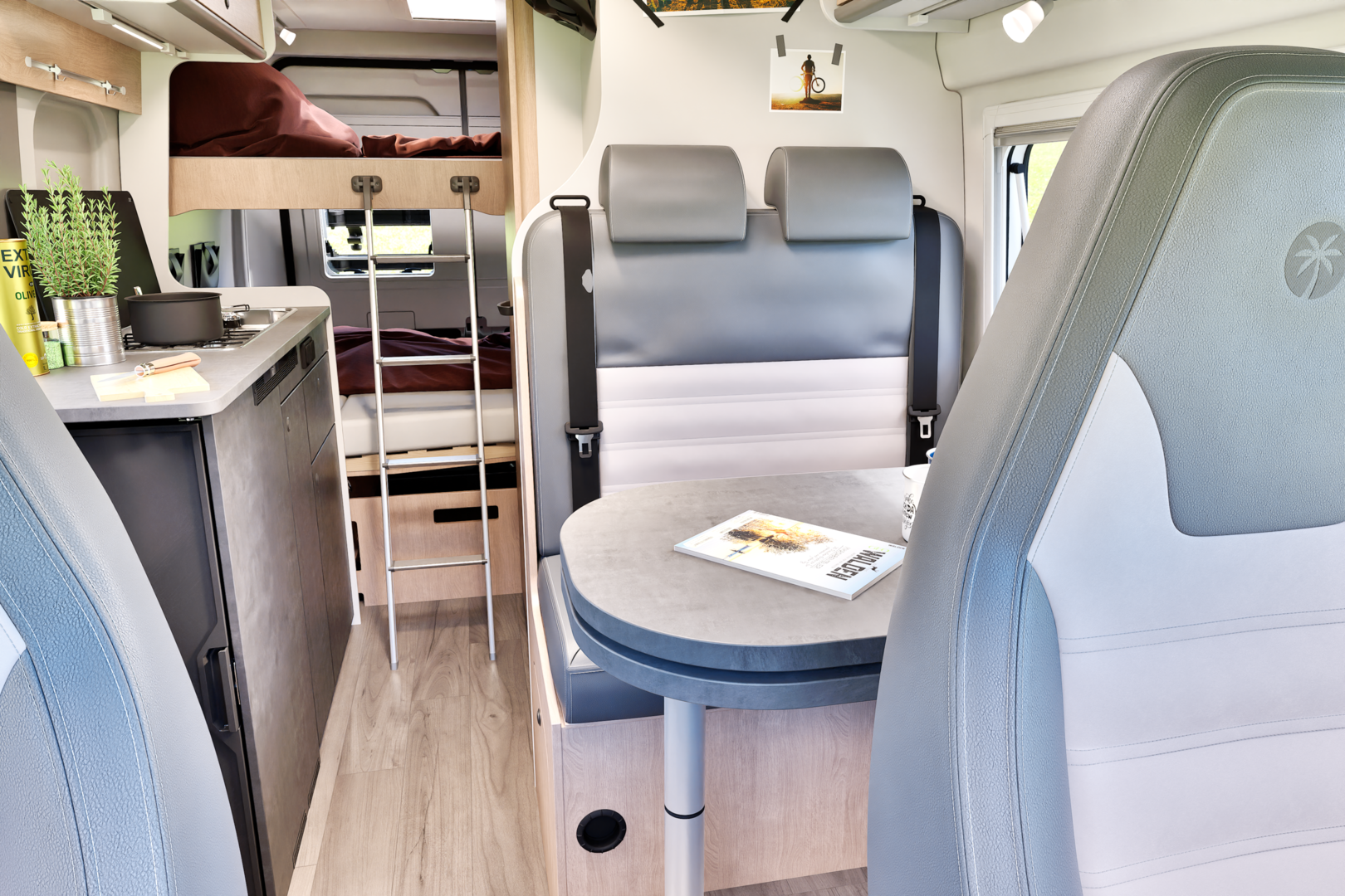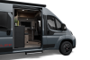 Trotz seiner kompakten Größe bietet er eine durchdachte Ausstattung: eine großzügige Heckgarage für Bikes oder Equipment, komfortable Schlafplätze für dich und deine Familie, eine praktische Sitzgruppe und Küche für spontane Pausen sowie ein modernes Interieur mit hochwertigen Materialien.